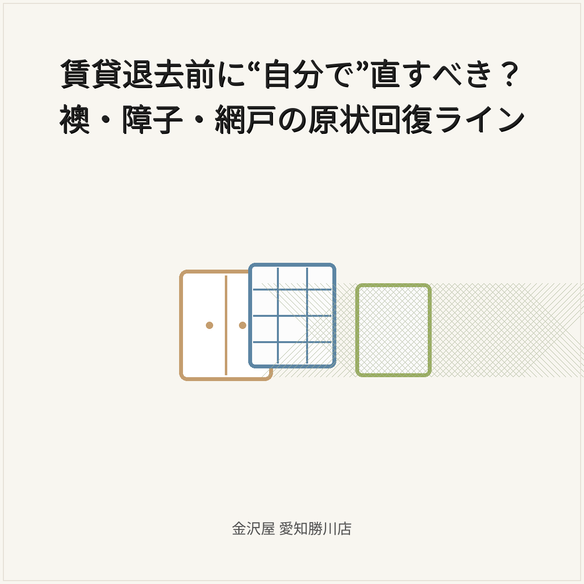 退去前に自分で直すべきか、それとも管理会社・オーナーに任せるべきか。 「原状回復」の考え方を踏まえつつ、襖・障子・網戸それぞれのDIY可否ラインと、退去時に揉めないための進め方をわかりやすく解説します。 電話で相談(01 […]