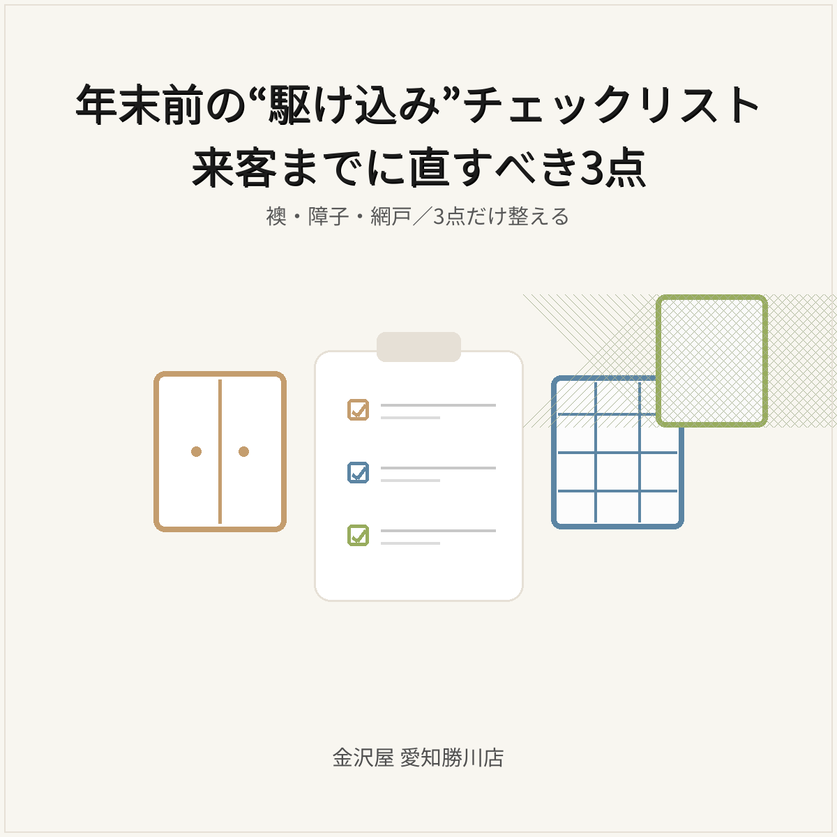 「年末の来客までに、どこを直せば“整って見える”か?」 最短インパクトの3点(襖・障子・網戸)に絞った駆け込みチェックリストです。5分でセルフ診断→そのまま依頼の判断ができます。 電話で相談(0120-963-483) […]