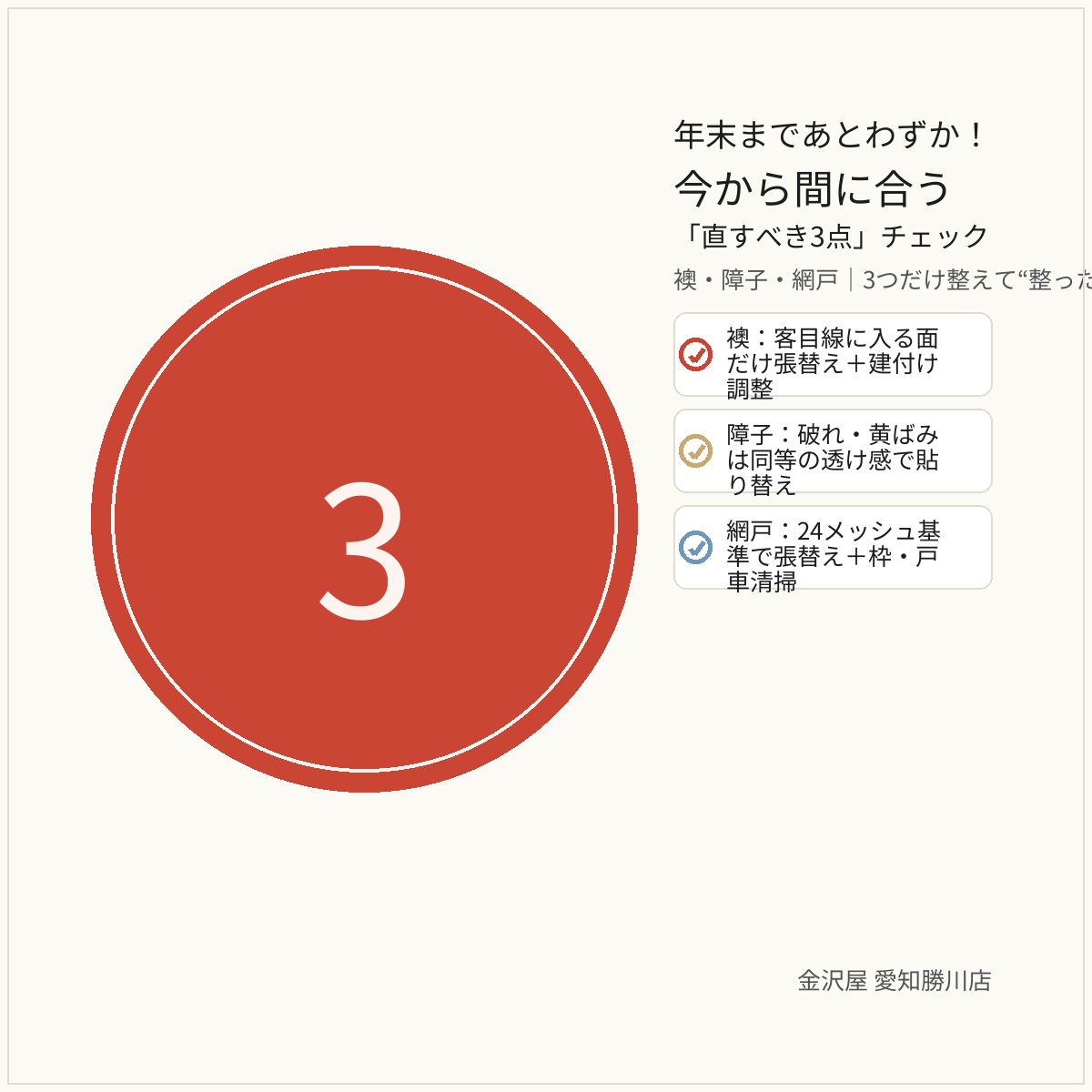 年末まであとわずか——来客に間に合わせるなら、全部やる必要はありません。 まずは襖・障子・網戸の「直すべき3点」だけ。最短で“整って見える”状態に仕上げるコツと段取りをまとめました。 電話で相談(0120-963-483 […]